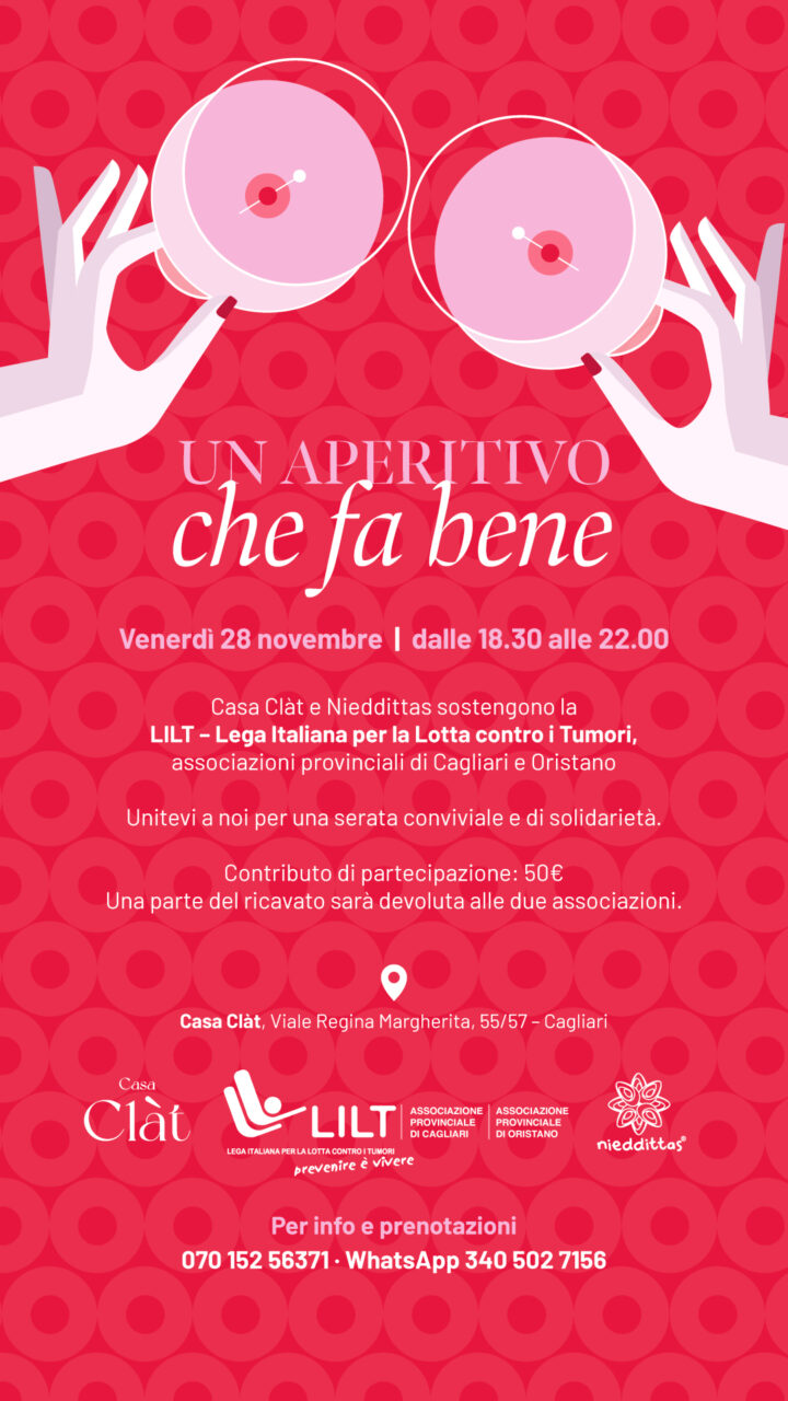 Casa Clàt e Nieddittas vi aspettano per un aperitivo solidale a sostegno della LILT – Lega Italiana per la Lotta contro i Tumori, associazioni provinciali di Cagliari e Oristano.